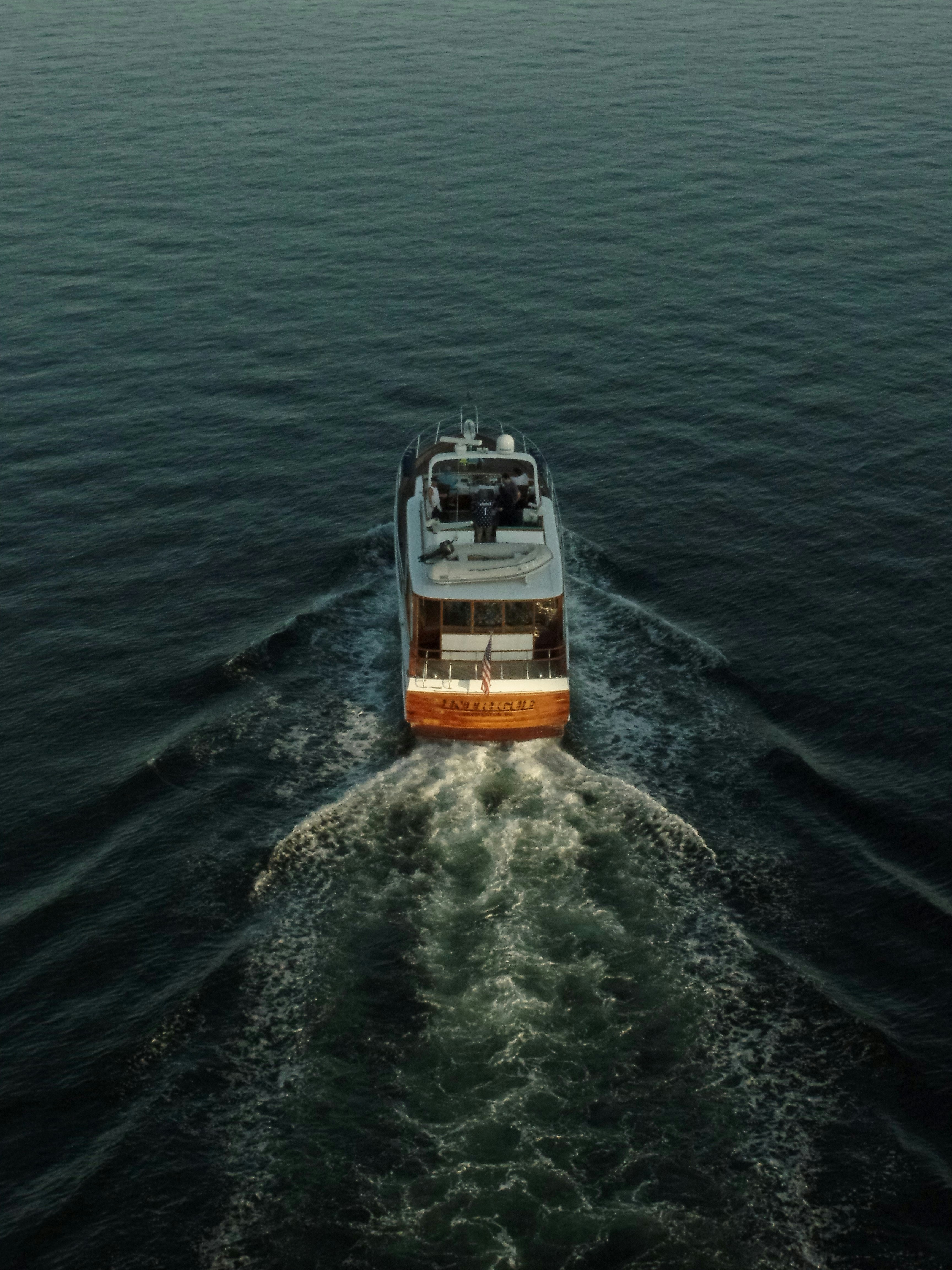 If you see a large wave mounting up ahead, don’t run over the top; you risk plunging into the trough beyond, burying your bow. You may decide to run up a little onto its back, but remain behind the crest until it crumbles ahead of you, allowing you to power through the turbulence. Even a slow-moving displacement hull can sometimes do this, depending on the wave and your boat speed.
